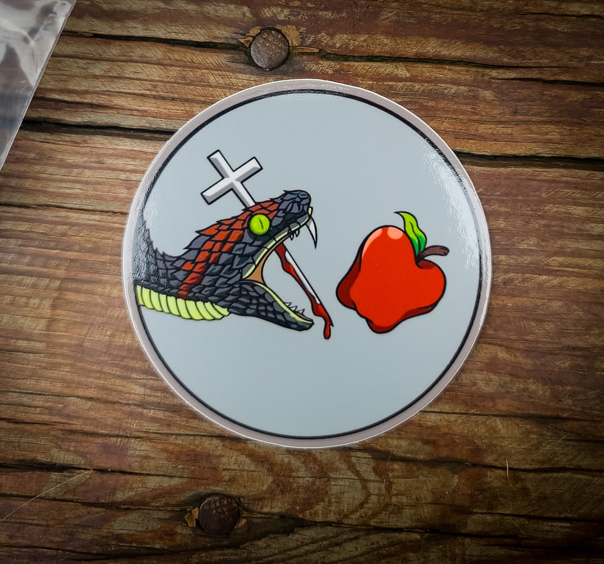 𝚃𝚑𝚒𝚜 𝚜𝚝𝚒𝚌𝚔𝚎𝚛 𝚜𝚑𝚘𝚠𝚜 𝚝𝚑𝚎 𝚜𝚎𝚛𝚙𝚎𝚗𝚝 𝚊𝚗𝚍 𝚏𝚘𝚛𝚋𝚒𝚍𝚍𝚎𝚗 𝚏𝚛𝚞𝚒𝚝 (𝚌𝚑𝚊𝚛𝚊𝚌𝚝𝚎𝚛𝚒𝚣𝚎𝚍 𝚋𝚢 𝚊𝚗 𝚊𝚙𝚙𝚕𝚎) 𝚜𝚢𝚖𝚋𝚘𝚕𝚒𝚣𝚒𝚗𝚐 𝚝𝚑𝚊𝚝 𝚘𝚛𝚒𝚐𝚒𝚗𝚊𝚕 𝚜𝚒𝚗, 𝚊𝚗𝚍 𝚝𝚑𝚎 𝚌𝚛𝚘𝚜𝚜 𝚙𝚒𝚎𝚛𝚌𝚒𝚗𝚐 𝚒𝚝𝚜 𝚜𝚔𝚞𝚕𝚕 𝚜𝚢𝚖𝚋𝚘𝚕𝚒𝚣𝚒𝚗𝚐 𝚘𝚞𝚛 𝚝𝚛𝚒𝚞𝚖𝚙𝚑 𝚘𝚟𝚎𝚛 𝚒𝚝 𝚝𝚑𝚛𝚘𝚞𝚐𝚑 𝚎𝚝𝚎𝚛𝚗𝚊𝚕 𝚕𝚒𝚏𝚎.